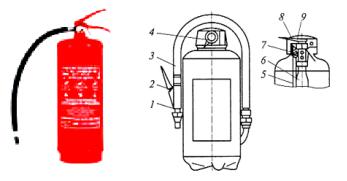 Рис. 4.2. Зовнішній вигляд та конструкція вуглекислотного вогнегасника ВВК-2: 1 – балон, 2 – обертовий розтруб, 3 – запірна голівка, 4 – сифонна трубка, 5 – гак, 6 – чека, 7 – ручка, 8 – хомут, 9 – упор