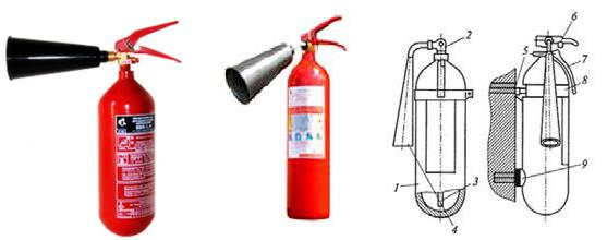 Вуглекислотні вогнегасники (рис. 4.2) – газові вогнегасники, призначені для гасіння невеликих пожеж різних речовин і матеріалів, а також електроустановок, кабелів і дротів, що знаходяться під напругою до 1000 В. Не можна гасити ними спирт і ацетон, оскільки вони розчиняють вуглекислоту, а також речовини, що горять без доступу повітря.