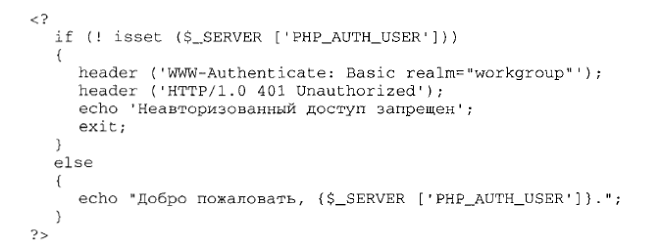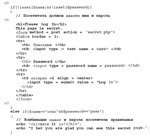 8 Створіть сценарій у якому використовується авторизація. Якщо користувач введе ім’я та пароль, його ім’я буде відображено. Якщо ж регістраційне ім’я не буде задано, доступ буде заборонений. Збережіть отриманий код.