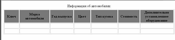 5 Для того, щоб заповнити таблицю, скористайтеся прикладом коду, описаним вище, у якому змініть mysql_query("SELECT * FROM avto", $db); на mysql_query ("INSERT INTO avto (key,marka,year,color,kuzov,cost,dodatok) VALUES ('1','BMW','2007','grey','sedan','30000','electro');",$db);