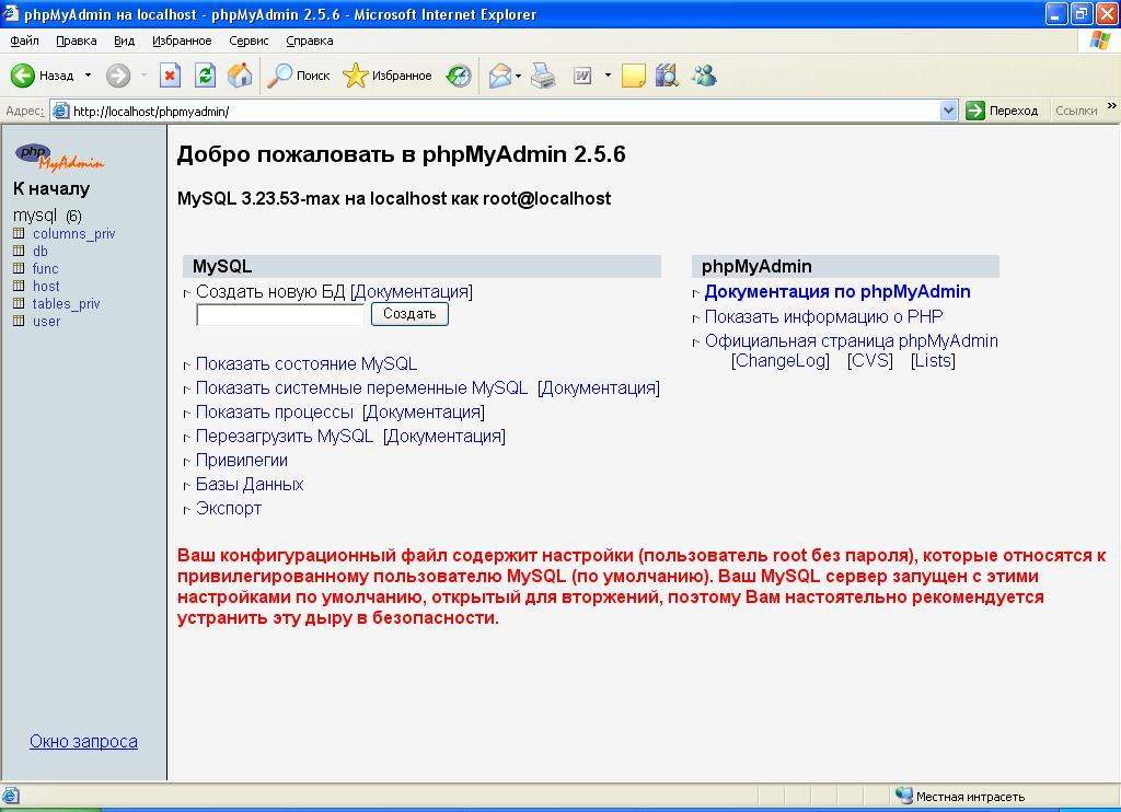Малюнок 10.1 - Виведення головної сторінки додатку phpMyAdmin
