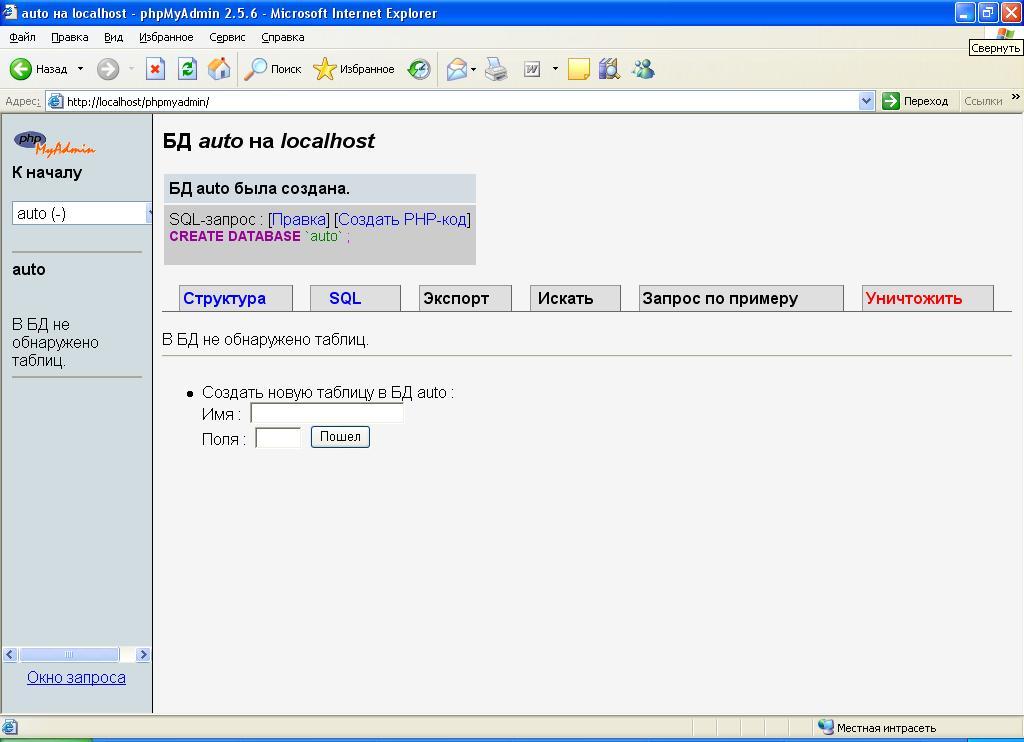 2 Впевнившись, що сервер запущений і працює нормально, створіть базу даних для зберігання інформації щодо виставлених на продаж автомобілів. Для цього у текстовому полі впишіть назву БД і натисніть кнопку "Создать". База даних повинна містити таблицю, тому створюємо таблицю у вікні, зображеному на малюнку (мал.10.2).