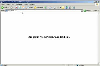 16 Виконайте перевірку працездатності встановленого сервера. Для цього в адресному рядку вашої програми браузеру введіть http://test1.ru/. В вікні вашого браузера повиннен відобразитися напис, зображений на малюнку 1.6. Це характеризує працездатність вашого сервера.