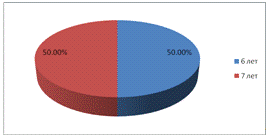 Из данных диаграммы следует, что дети в возрасте 6 и 7 лет были представлены в выборке в равных пропорциях.