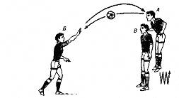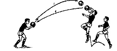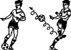 . Два игрока встают в 15-16 шагах друг от друга. Их задача - точно посылать мяч друг другу. Причем один удар выполняется по неподвижному мячу, другой - с полулета. Каждый из них должен выполнить по 10-15 ударов с полулета.
