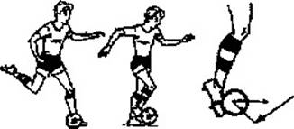 опорной ноги. В момент удара стопа как бы вскользь прокатывается по мячу,