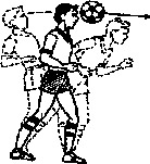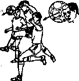 . Упражняются три игрока. Игрок А встает в затылок игроку В. Игрок Б встает с мячом в руках в 3 м от них. Он набрасывает мяч так, чтобы игрок А (рис. 16), подпрыгнув вертикально вверх, ударом головой направил его назад и т. д. Игрок В действует пассивно. После 8-10 ударов занимающиеся меняются ролями.