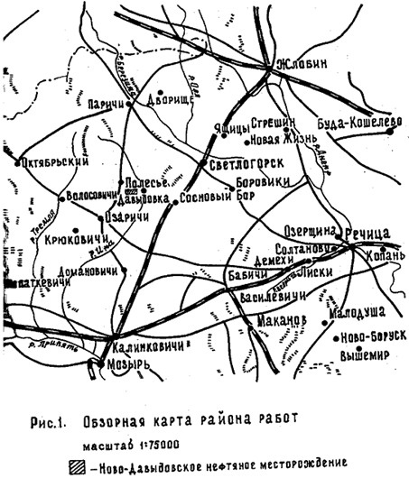 Наиболее крупными населенными пунктами района являются города: Гомель, Речица, Мозырь, Калинковичи, Светлогорск, где сосредоточено большое количество различных промышленных предприятий. Ближайшими к месторождению населенными пунктами являются городские поселки Озаричи, Сосновый Бор, Октябрьский и другие. Города и крупные населенные пункты связаны между собой шоссейными дорогами. В непосредственной близости от месторождения проходит асфальтированная дорога Калинковичи-Озаричи-Паричи. Железная дорога соединяет города Калинковичи-Светлогорск с ближайшей к месторождению железнодорожной станцией Сосновый Бор (рис. 1). Месторождение находится в центре построенных систем нефтегазодобычи.
