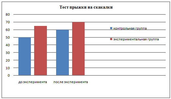 Тест - прыжки на скакалки показал в начале эксперимента , в контрольной группе составил-50р, а в экспериментальной группе-65р.В конце эксперимента в контрольной группе составил-60р, в экспериментальной группе-70р.