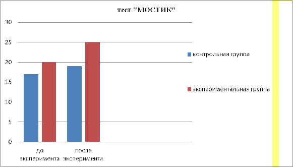 Тест - Мостик показал в начале эксперимента, в контрольной группе составил 17см, а в экспериментальной группе-20см. В конце эксперимента в контрольной группе составил-19см, в экспериментальной группе-25см.