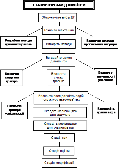 Ділові ігри можна будувати по-різному: або кожен гравець перед грою отримує точні інструкції, або лише приблизний перелік того, що йому доведеться зробити. Орієнтовно процедуру розробки гри зображено на рис.