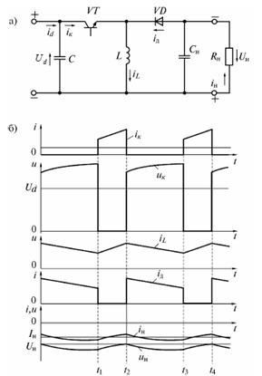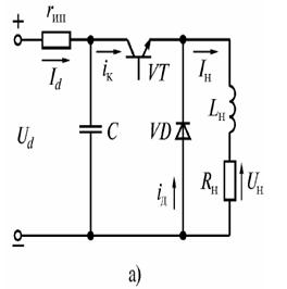 На мал. 1.4а показано схему безпосереднього ППН, інвертую чого напругу (тобто змінюю чого не тільки величину, а й знак напруги на виході), на мал. 1.4б - діаграми напруг на навантаженні uн та на колекторі uк та струмів: поглинаючого від джерела живлення id, колектора iк, діода iд та навантаження iн.