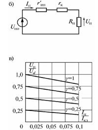 Мал. 1.9 Схема заміщення (а)та еквівалентна схема ППН (б), а також його зовнішні характеристики (в)з урахуванням внутрішнього опору джерела живлення