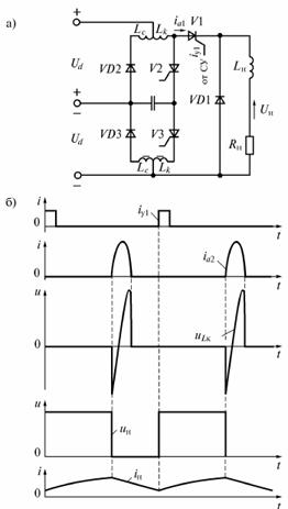 Мал. 1.10 Схема ППН на тиристорах (а) та діаграми напруг та струмів,що ілюструють його роботу (б)