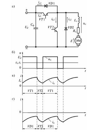 В руховому режимі схема працює, як звичайний понижуючий ППН, тобто, по черзі проводять транзистор VT1 та діод VD2. Процеси ілюструють діаграми мал. 1.11 б - в. В гальмуючому режимі електромашина переходить в режим генератора, але її ЕРС не може миттєво змінитись. ЕРС генератора нижче ніж напруга джерела живлення, тому діод VD1 закритий і струм від генератора не може проходити в джерело живлення. При ввімкненні транзистора VT2 генератор замикається на індуктивність Lн і струм в ланцюгу збільшується. При вимкненні VT2 ЕРСсамоіндукції діє згідно з ЕРС генератора, діод VD1 відкривається, енергія передається в джерело живлення. Ці процеси ілюструють діаграми мал. 1.11 б, г.