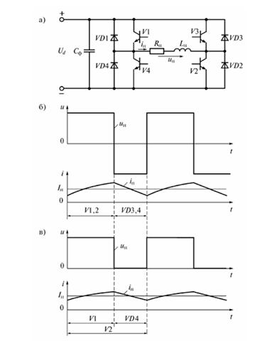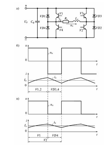 В електроприладах використовують реверсивні ППН, що дозволяють змінювати не тільки величину, а й знак напруги на навантаженні. На мал. 1.12 а показано схему реверсивного ППН, що отримала найбільше розповсюдження. Пари транзисторів V1, V2 та V3, V4 утворюють діагоналі мосту, а пари транзисторів V1, V4 та V2, V3 утворюють стійки мосту. При попарному включенні транзисторів V1, V2 або V3, V4 знаки напруги на навантаженні протилежні.
