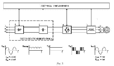 У інверторі здійснюється перетворення постійної напруги ud в трифазну (або однофазну) імпульсна напруга u і змінюваної амплітуди і частоти. За сигналами системи управління кожна обмотка електричного двигуна приєднується через відповідні силові транзистори інвертора до позитивного і негативного полюсів ланки постійного струму. Тривалість підключення кожної обмотки в межах періоду проходження імпульсів модулюється за синусоїдальним законом. Найбільша ширина імпульсів забезпечується в середині напівперіоду, а до початку і кінця напівперіоду зменшується. Таким чином, система управління забезпечує широтно-імпульсну модуляцію (ШІМ) напруги, що прикладається до обмоток двигуна. Амплітуда і частота напруги визначаються параметрами модулюючої синусоїдальної функції.