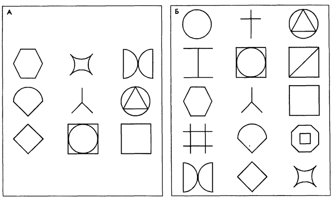«На этой картинке представлены девять разных фигур. Постарайся запомнить их и затем узнать на другой картинке, которую я тебе сейчас покажу. На ней, кроме девяти ранее показанных изображений, имеется еще шесть таких, которые ты до сих пор не видел. Постарайся узнать и показать на второй картинке только те изображения, которые ты видел на первой из картинок».