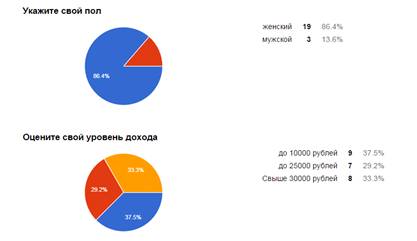 Заключающими в анкете (Рис.4) были вопросы о гендерной принадлежности и уровне дохода. Анкетируемые в своем большинстве были женщины, поскольку в России косметические средства и декоративную косметику преимущественно используют именно они. В своем большинстве наши респонденты были с низким уровнем дохода. Скорее всего этот фактор зависит от того, что на втором месте по количеству прошенных находятся студенты, чей доход в подавляющем большинстве и не может быть выше, но это не значит, что их не стоит брать как целевую аудиторию потребителей. Данная социальная группа может повышать свою покупательскую способность за счет своих родителей, что позволит им покупать более дорогую и качественную продукцию.