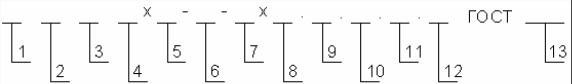 Обозначения, принятые на схеме: 1 — наименование изделия; 2 — класс точности; 3 — исполнение; 4 — номинальный диаметр резьбы; 5 — мелкий шаг резьбы; 6 — направление резьбы; 7 — поле допуска резьбы; 8 — длина изделия (кроме гаек); 9 — класс прочности или условное обозначение группы; 10 — указание о применении спокойной (С) или автоматной (А) стали; 11 — марка материала для изделий классов прочности 05; 8; 8.8 и выше, групп 21 – 26 и 31 -35; 12 — вид и суммарная толщина покрытия; 13 — номер стандарта на продукцию.