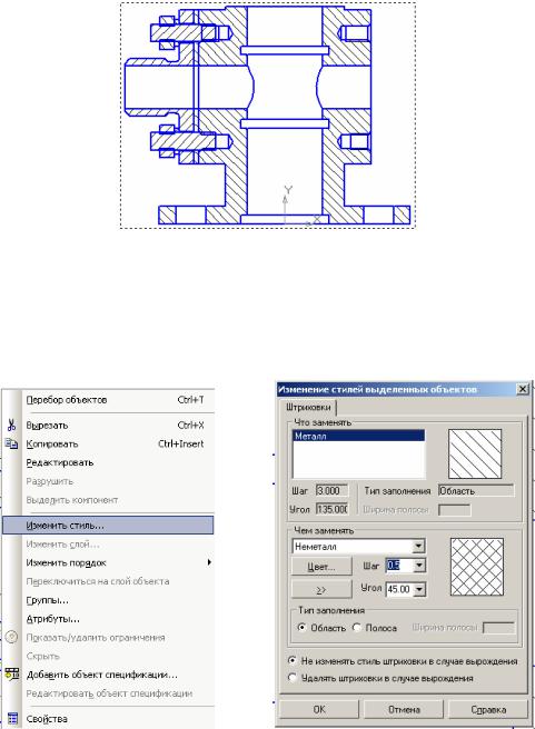 17. При создании разрезов и сечений, система автоматически штрихует все компоненты, попавшие в секущую плоскость, причем смежные детали штрихуются в разные стороны (по умолчанию установлен стиль штриховки Металл и расстояние между линиями штриховки 1,5 мм) (рис. 3.32). Выделите в чертеже штриховку детали Прокладка боковая, из контекстного меню вызовите команду Из-