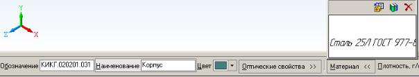 1. Откройте файл детали Корпус. Щелкните правой кнопкой мыши. Появится контекстное меню. Выберите в нем пункт Свойства. Появится панель Свойства. Введите обозначение детали КИКГ.020201.031, ее наименование Корпус и материал, из которого она изготовлена: Сталь 25Л ГОСТ 977-88 (рис. 3.38). Закройте диалог определения свойств детали. Убедитесь в том, что вершина дерева модели текущая (выделена цветом). Если это не так, сделайте ее текущей.