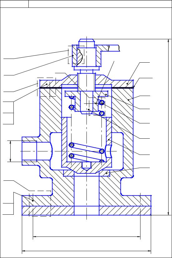поставлен клапан 5. Пружина 8 опирается на клапан 5 и седло 3. Рабочее состояние пружины достигается посредством винта 4. Вращение винта осуществляется ручкой 7, которая соединяется с винтом посредством призматической шпонки 19. В камере клапана просверлено отверстие для обеспечения атмосферного давления. Поставить или вынуть клапан из корпуса можно посредством стержня, ввернутого в отверстие клапана. Прокладка 10 обеспечивает плотное прилегание крышки 2 к корпусу I посредством шпилек 18, гаек и шайб. Седло 3 крепится винтом 13 к ходовому винту 4.