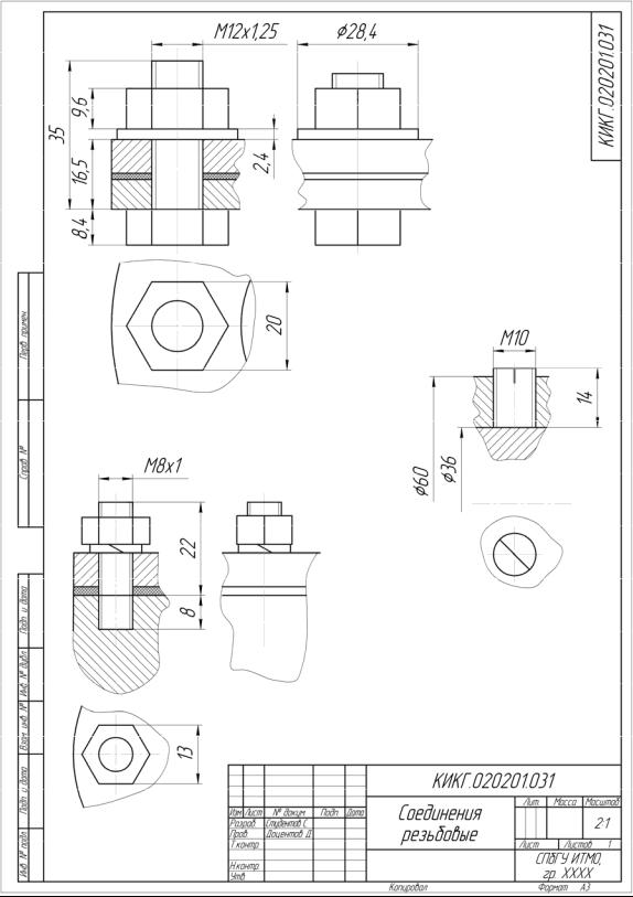 Упрощенное изображение болтового, винтового и шпилечного соединений выполняется на листе формата А3 (рис. 1.3) по данным, представленным на рис. 1.1, и 1.2.
