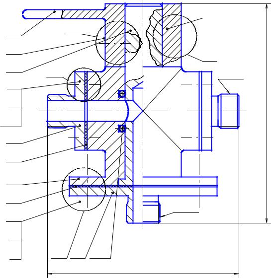 На рис. 1.1 кран изображен в открытом положении. При положении рукоятки, указанном на чертеже, жидкость по трубопроводу (трубопроводы на чертеже не указаны) подходит к фланцу 5, а затем по отверстиям пробки проходит в полости цилиндрических отверстий корпуса и фланцев 4 и поступает к трубопроводам системы. Пробка при повороте цилиндрической частью на 90 ° в любую