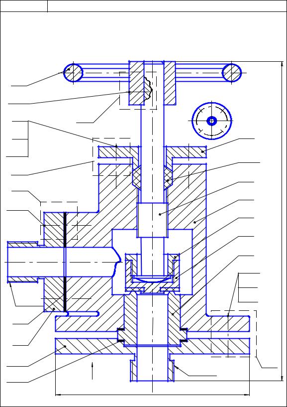 резьбовой втулки 6 закреплен клапан 1, состоящий из двух деталей: металлической втулки и наплавленной резиновой прокладки. На верхнем конце шпинделя закреплен при помощи установочного винта 13 маховик 5. На корпусе 2 установлена втулка сальника 4, которая уплотняет сальниковую набивку 20. Фланец 9 закреплен на корпусе винтами 14. В нижнем отверстии корпуса установлен стакан 7, который удерживается в корпусе при помощи фланца 10, соединенного с корпусом болтами 12. На чертеже вентиль изображен в закрытом положении.