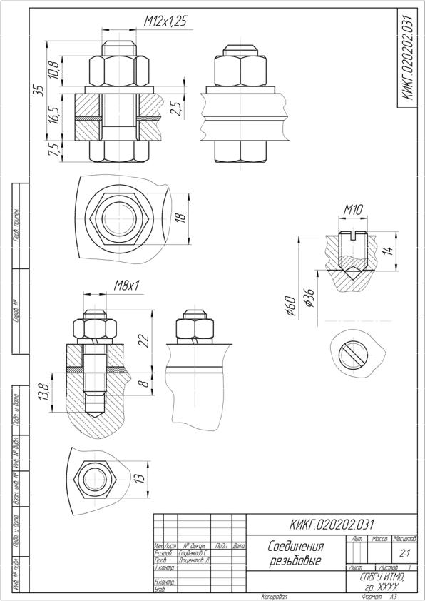 Конструктивное изображение болтового, винтового и шпилечного соединений показано на рис. 1.5 и выполняется на листе формата А3 по данным, представленным на рис. 1.1, и 1.2.