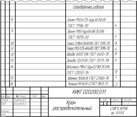 Спецификация оформляется по исходным данным рис. 1.2. По результатам выполнения сборочного чертежа, т. е. после определения параметров стандартных изделий полностью заполняются соответствующие строки раздела “Cтандартные изделия” спецификации
