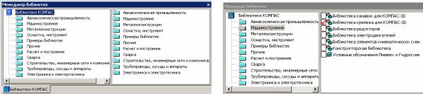 После этого в нижней части экрана появится диалоговое окно со списком разделов, включенных в систему КОМПАС (рис. 3.1, а). Диалоговое окно состоит из двух частей. В левой части окна находится список разделов библиотеки — предварительно все библиотеки сгруппированы в одиннадцать разделов. На рис. 3.1, а) этот же список продублирован и в правой части диалогового окна, потому что ни один из разделов не открыт.