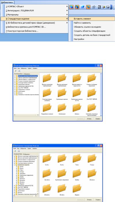 Чтобы посмотреть, какие библиотеки содержатся в том или ином разделе, выделите мышью название раздела, и в правой части диалогового окна раскроется список этого раздела. Раскройте нужный раздел библиотеки, и в правой части диалогового окна дважды щелкните мышью на названии выбранной библиотеки, Библиотека крепежа для КОМПАС 3-D (рис. 3.1, б).