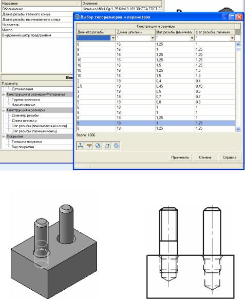 На рис. 3.10 в аксонометрии (а) и на виде спереди (б) показаны результаты добавления шпильки из Библиотеки Стандартных Изделий (слева) и из Библиотеки крепежа для КОМПАС 3-D (справа)