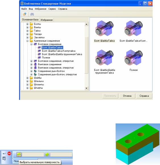 Откройте Библиотеку Стандартные Изделия. В Дереве библиотеки раскройте «ветви» Крепежные изделия – Крепежные соединения – Болтовое соединение. Выполните двойной щелчок мышью на элементе Болт::Шайба-Гайка — система перейдет в режим позиционирования соединения (рис. 3.11).