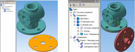 7.Добавьте в сборку третий компонент — Фланец нижний (рис. 3.18, б). Внесите наименования компонента в Дерево модели.