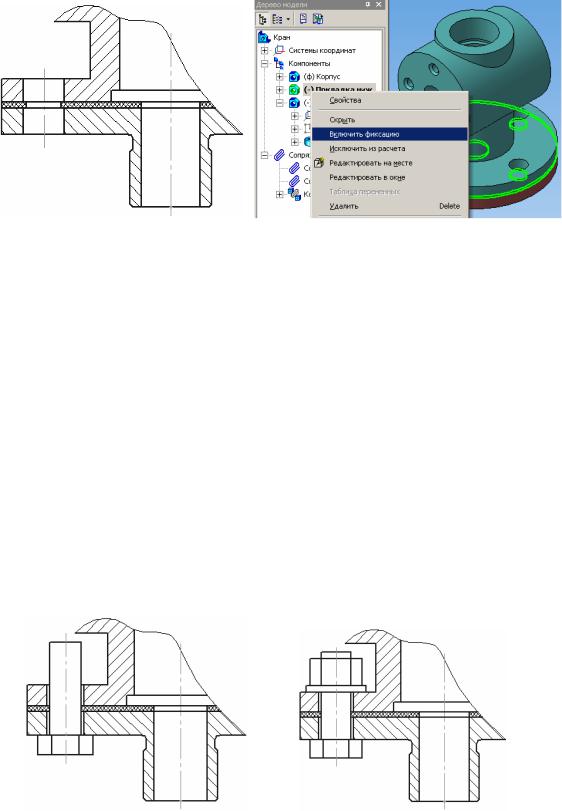 17.Из библиотеки крепежа поочередно выберите шайбу и гайку необходимых размеров. Для окончательного размещении этих компонентов (рис. 3.20, б) укажите соответствующие элементы базирования.