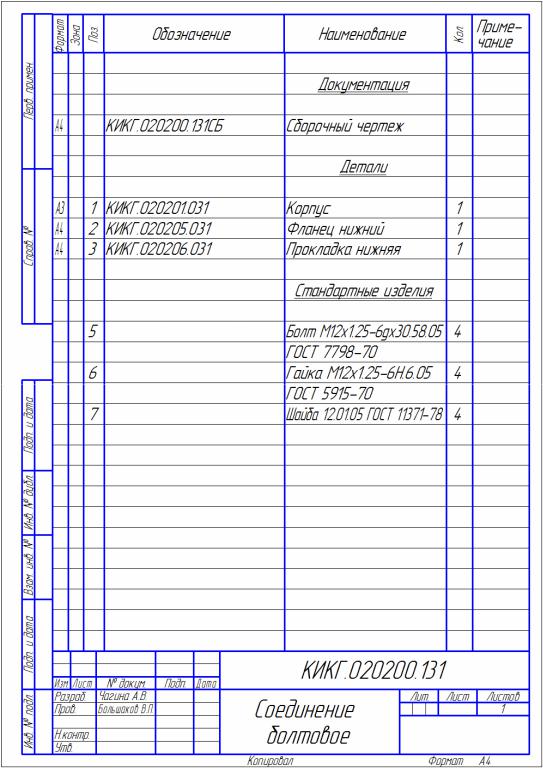 5. Заполните для каждой детали необходимые графы. В наименованиях, состоящих из нескольких слов, на первом месте помещают имя существительное, например, Фланец нижний. Наименования деталей указываются в порядке увеличения номера обозначения.