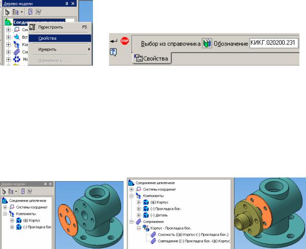 2. В Дереве модели выполните двойной щелчок на элементе Соединение шпилечное. Из контекстного меню вызовите команду Свойства и на панели свойств укажите Обозначение (рис. 3.25, б)