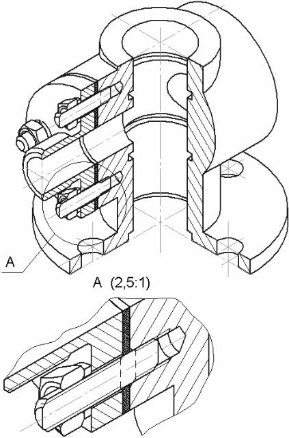 13. После выполнения операции Массив по концентрической сетке создайте модель соединения с 4 шпильками. На рис. 3.28 показан фрагмент чертежа, включающего аксонометрию сборки с вырезом, а также выносной элемент. Шпильки и гайки показаны без упрощений.