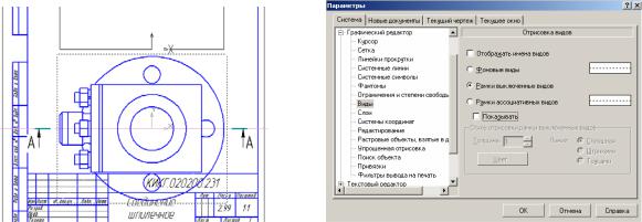 16.Несмотря на то, что Вид сверху был погашен, разрез находится с ним в проекционной связи. Для облегчения компоновки чертежа проекционную связь целесообразно отключить. Щелкните правой кнопкой внутри выделенного вида и отключите в контекстном