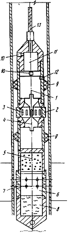 В результате большого перепада давления между атмосферным в имплозионных камерах и давлением в пласте получается как бы резкий "хлопок", который способствует очищению пласта и перфорационных отверстий от продуктов термохимического воздействия, а вслед за этим действует гидродинамический удар всего столба жидкости на стенки скважины, в результате чего в пласте образуются новые и раскрываются ранее образованные трещины. В дальнейшем наблюдается затухающий колебательный процесс, и возникающие при этом перепады давления осуществляют дополнительную прочистку поровых каналов в пласте. Процесс, происходящий в имплозионных камерах и в скважине, фиксируют датчиками давления и температуры (10), по данным которых определяют эффективность воздействия и, в случае необходимости обработку пласта повторяют. Устройство состоит из отдельных частей, сборку которых обеспечивают унифицированные соединительные узлы. Поэтому в случае необходимости можно использовать различные варианты этих частей. В тех случаях, когда обрабатываемый пласт расположен близко к забою скважины, нижнюю имплозионную камеру можно не использовать. При необходимости дополнительной очистки пласта можно убрать термогазогенератор (5). В случае очистки призабойной зоны и забоя скважины можно убрать нижнюю имплозионную камеру (1) и термогазогенератор (5).