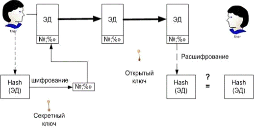 Схема формирования подписи ЭД его отправителем включает вычисление хэш-функции ЭД и шифрование этого значения посредством секретного ключа отправителя. Результатом шифрования является значение ЭЦП ЭД (реквизит ЭД), которое пересылается вместе с самим ЭД получателю. При этом получателю сообщения должен быть предварительно передан открытый ключ отправителя сообщения.