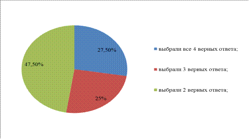 Ответили верно (выбрали все четыре правильных ответа) лишь чуть больше четверти опрашиваемых, что говорит о невысокой осведомленности в данном вопросе и о неполноте знаний правил безопасности дорожного движения. Дали три верных ответа примерно 25%, что говорит о том, что большинство учеников знает не все основные причины аварий.