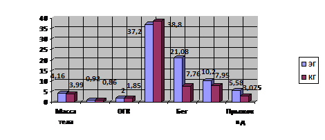 Анализ физического развития после эксперимента по показателям длина тела, ОГК выявил, что группы не отличаются существенно (tр<tкр). По показателям масса тела, мышечная сила рук, бег 30 метров, челночный бег, прыжок в длину - отличаются существенно tр>tкр. Прирост показателей на 21,083% в экспериментальной, 7,76 % - в контрольной группах в беге на 30 метров, аналогично 10,2% и 7,95% в челночном беге и аналогично 5,58% и 3,075% в прыжке в длину.