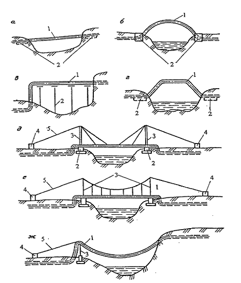 При переходе в виде самонесущей провисающей нити (рис. 2 ж) трубопровод подвешивается к опорным устройствам и материал труб воспринимает нагрузку от собственной массы и массы перекачиваемого продукта.