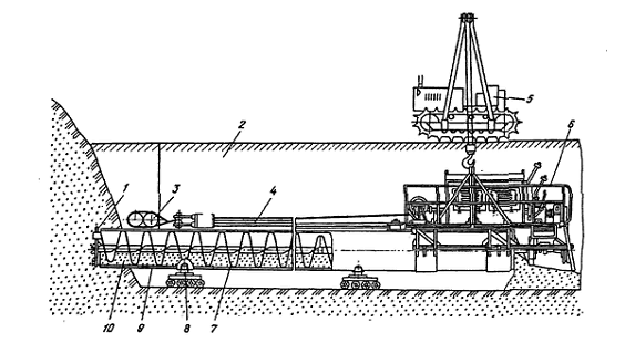 Сущность способа продавливания состоит в том, что кожух вдавливается в грунт открытым концом, а поступающий внутрь кожуха грунт удаляется. При этом усилие продавливания существенно меньше, т.к. определяется в основном силой трения грунта о наружную поверхность кожуха. Чтобы еще больше уменьшить сопротивление головную часть кожуха снабжают специальным режущим кольцом с диаметром на 30...40 мм больше диаметра основной трубы. Усилие на заднюю часть кожуха также создается домкратами. Грунт из трубы удаляется механическими приспособлениями или гидроразмывом с последующей откачкой пульпы. Способ продавливания позволяет проходить за смену лишь 2...3 м при диаметре труб 1000... 1200 мм. Усилие продавливания при этом составляет от 140 до 300 т.