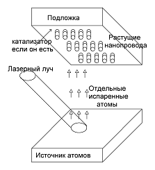 Напыленные нанопровода образуются на подложке из другого материала, например, в виде ряда атомов металла на непроводящей поверхности, это так называемый СVD-процесс. Он обычно осуществляется с помощью лазерной абляции ("стирания") атомов источника нанопроводов в состоянии типа пар-жидкость-твердое тело. [13]