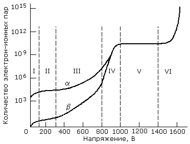Кривая для альфа-частиц лежит выше кривой для бета-частиц, т.к. альфа-частицы создают большую начальную ионизацию, чем бета-частицы. Альфа-частицы образуют больше электрон-ионных пар, так как имеют намного большую массу, чем бета-частицы. Каждую кривую можно разделить на характерные области. В области I происходят два конкурирующих процесса: собирание зарядов на электродах и рекомбинация ионов в газовом объеме. При увеличении поля скорость ионов увеличивается, что уменьшает вероятность рекомбинации, растет количество собранных зарядов и, соответственно, амплитуда сигналов. Эта область называется областью рекомбинации и для детектирования не используется.